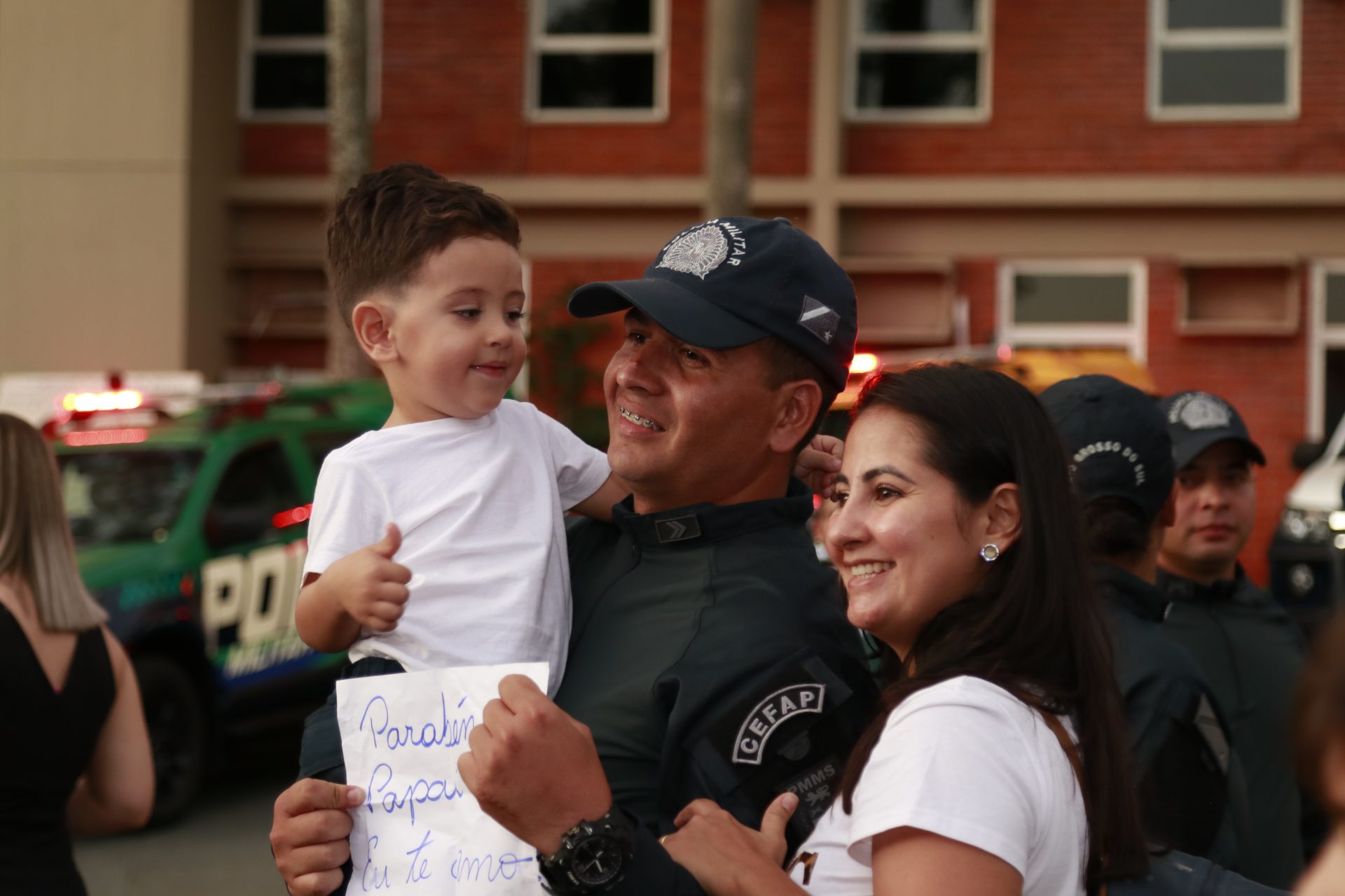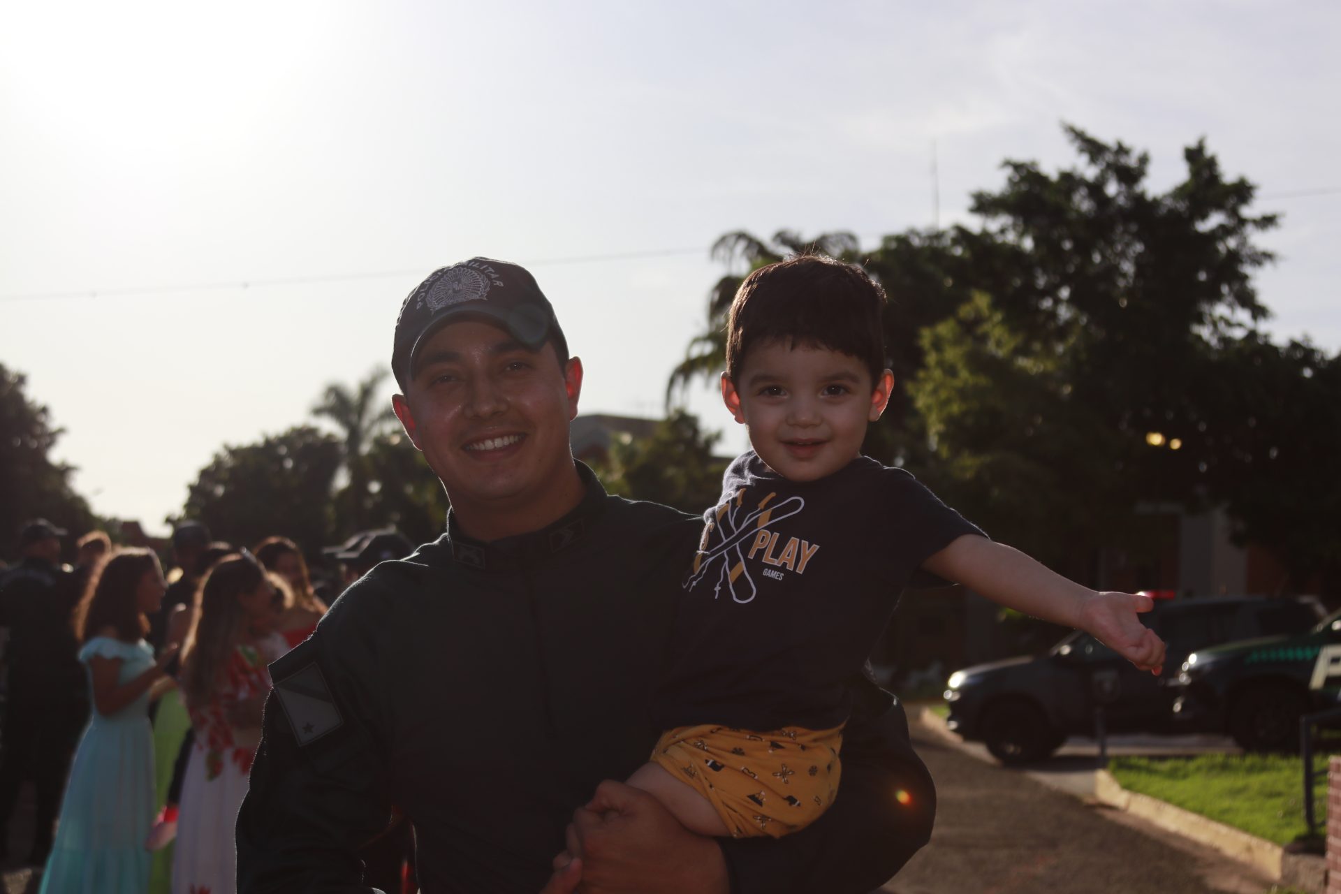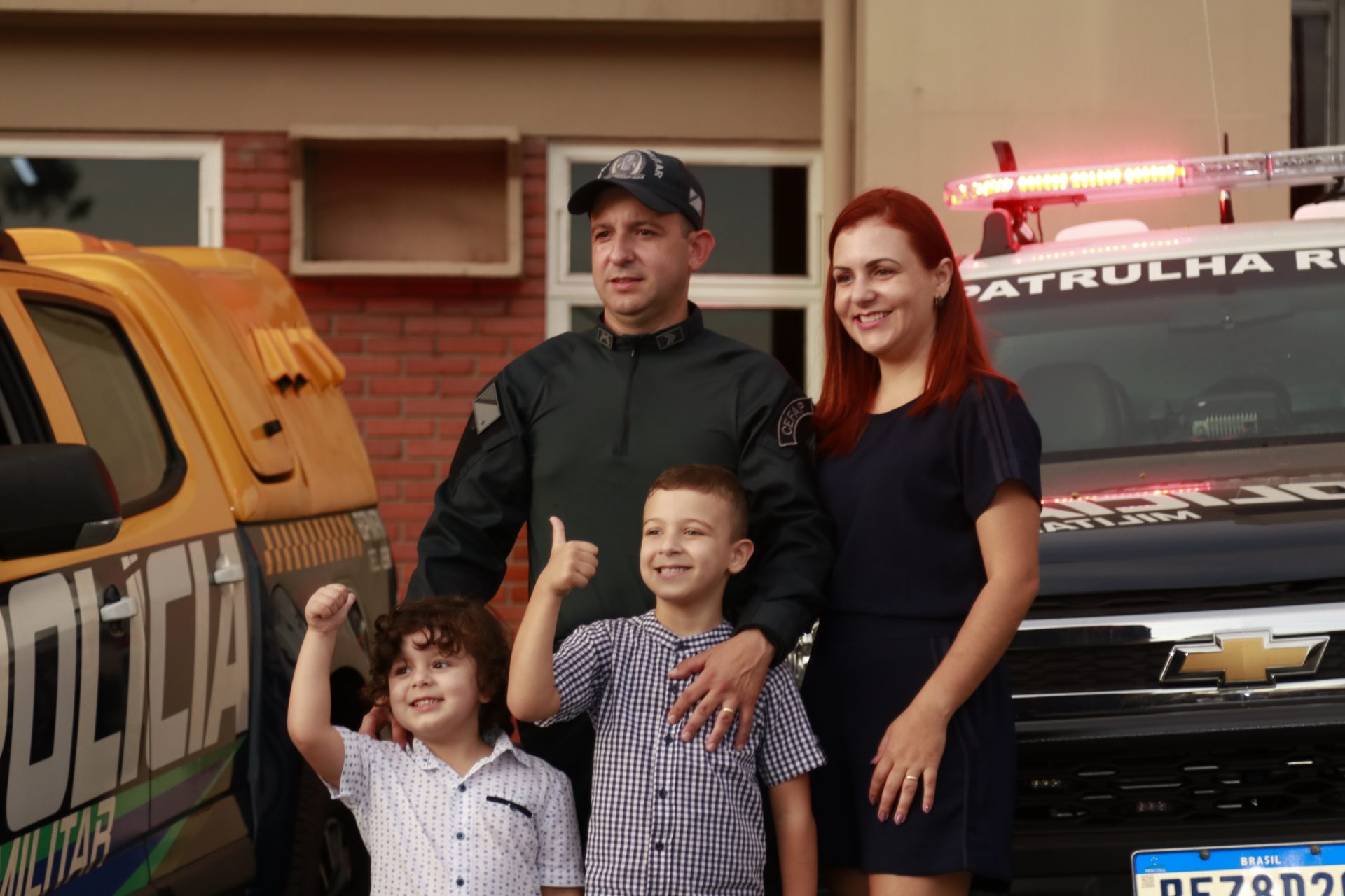 A senhora Isadora Chaves Cervelati, mãe do Soldado PM Estéfano José Cervelati (in memoriam), junto da sua nora sra Elaine Cervelati, e seus netos Lucas e Walesca, receberam da Cabo PM Tatiane e da Cabo PM Deisy, uma homenagem em nome dos formandos, na qual tem o seu filho, Soldado Cervelati como Nome de Turma do CFC 2022.