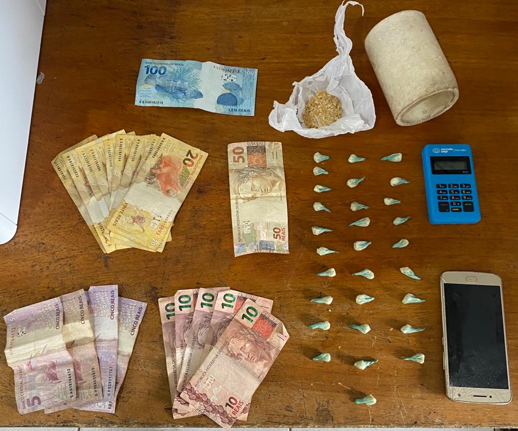 Realizaram a abordagem e foi observado que o produto comercializado aparenta ser substância análoga a crack, em seguida foi localizado no interior de uma caixa d’água 18 gramas da mesma substância, fracionado em diversas porções já preparadas para comercialização, além de dinheiro e máquina de cartão de crédito.