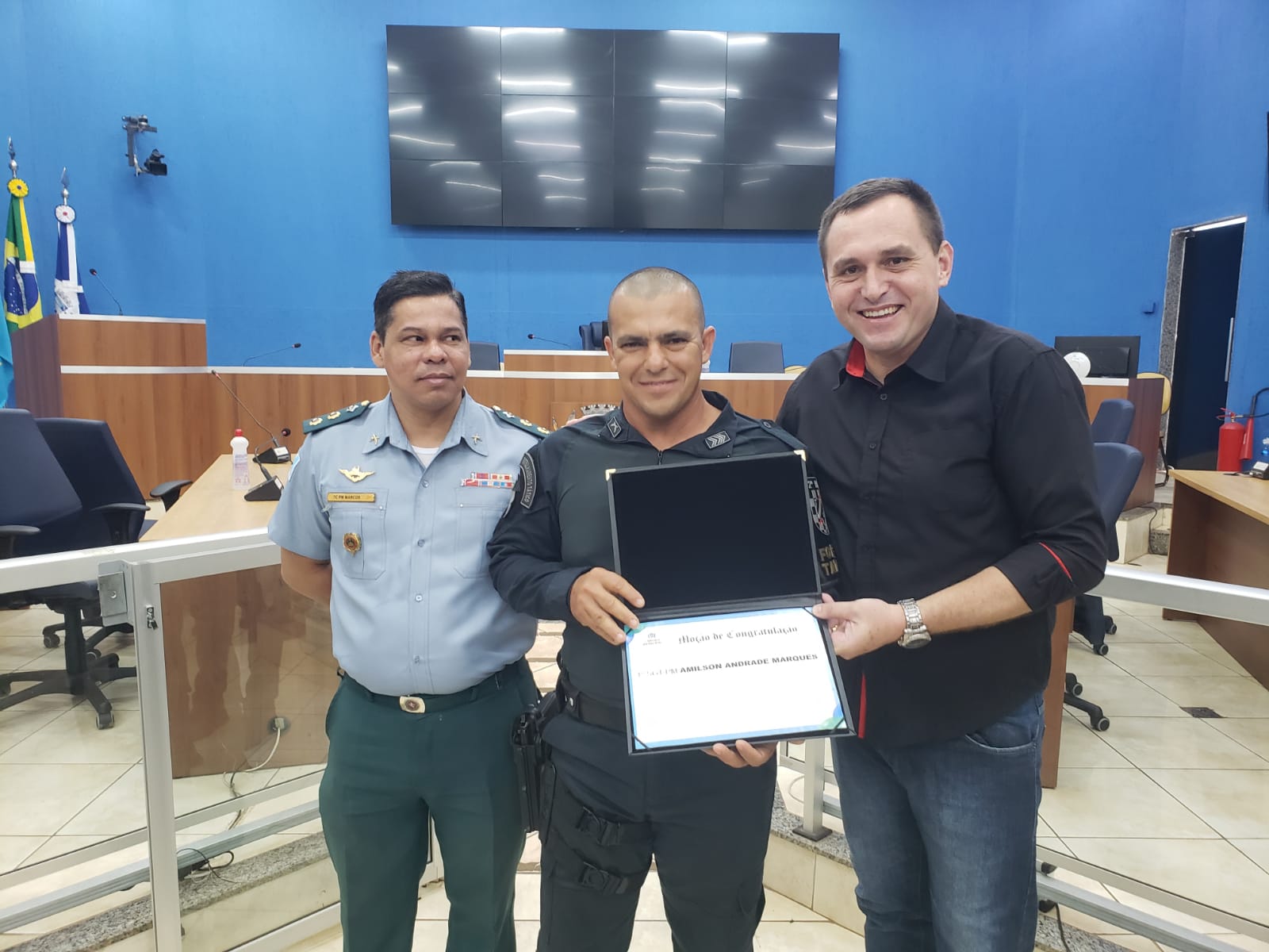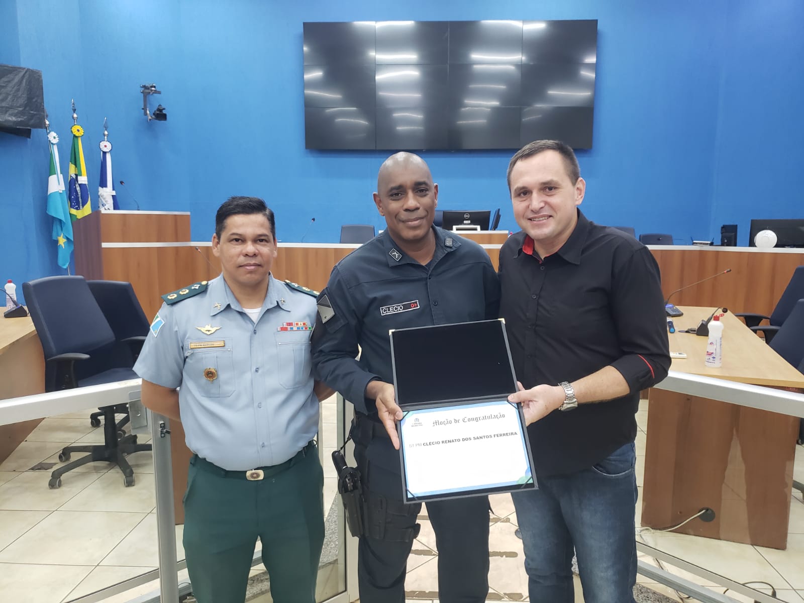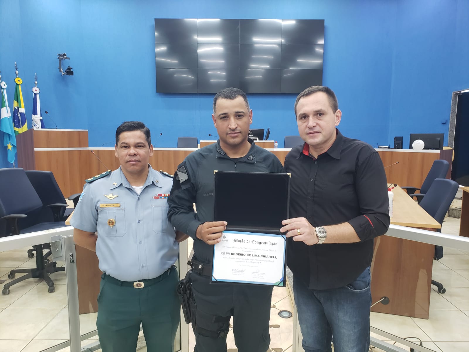 Na ocasião o Vereador Sargento Rodrigues agraciou os policiais: Cb PM Rogerio de Lima Chiarelli, 1º Sgt PM Amilson Andrade Marques, Subtenente PM Clécio Renato dos Santos Ferreira, com moções que foram deferidas pela Câmara Municipal, em razão dos relevantes serviços prestados a sociedade três-lagoense.