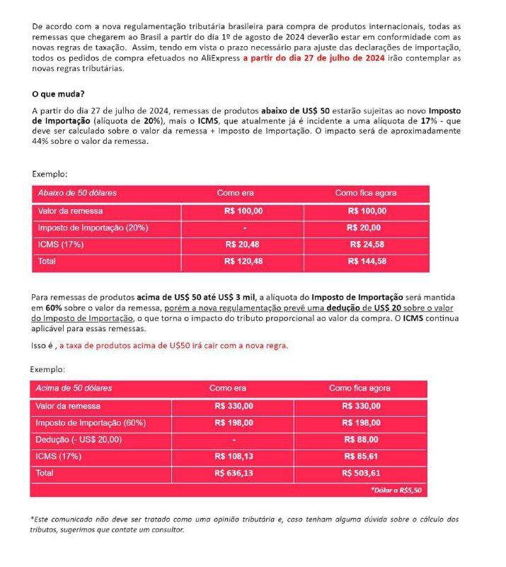 A partir de 27 de julho de 2024, todas as compras realizadas no AliExpress estarão sujeitas a novas regras tributárias, incluindo a aplicação de um imposto sobre compras abaixo de US$ 50. O comunicado oficial da empresa divulgado nesta sexta-feira (19) informa que todas as declarações de importação serão ajustadas conforme a nova regulamentação.
