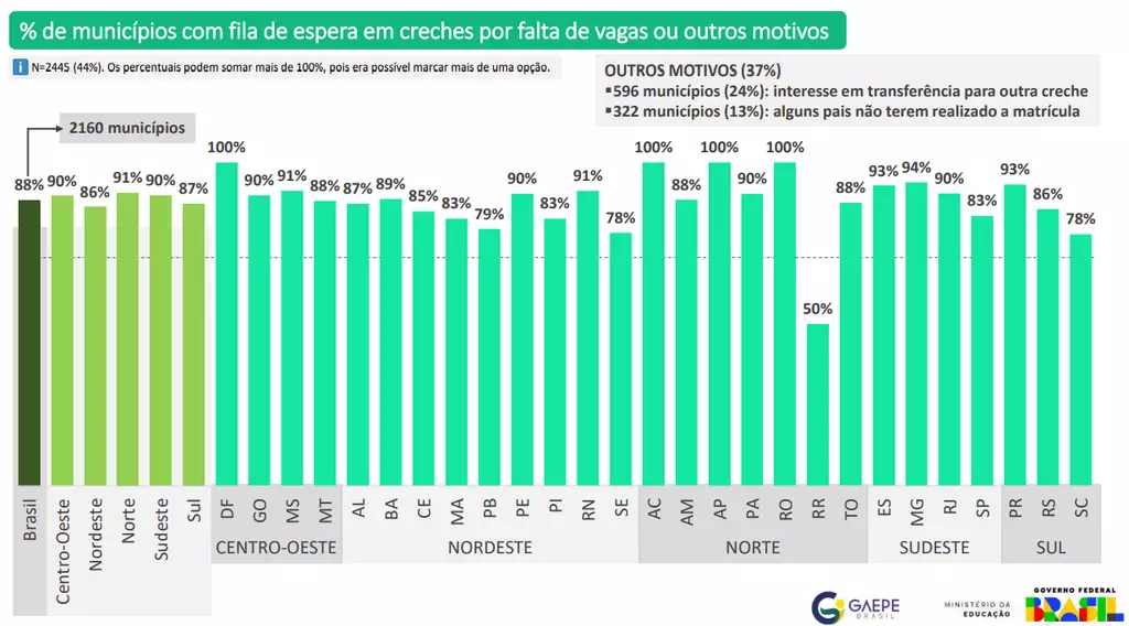 O problema é mais concentrado nas áreas urbanas do Estado, com 88% da falta de vagas sendo registrada nas cidades. Um dos pontos críticos levantados pela pesquisa é que apenas 40% dos municípios adotam critérios de prioridade na matrícula das crianças, com a maioria seguindo a ordem de inscrição. Onde esses critérios existem, são priorizadas crianças em situação de vulnerabilidade, como aquelas com mães solo ou em contextos de fragilidade econômica.